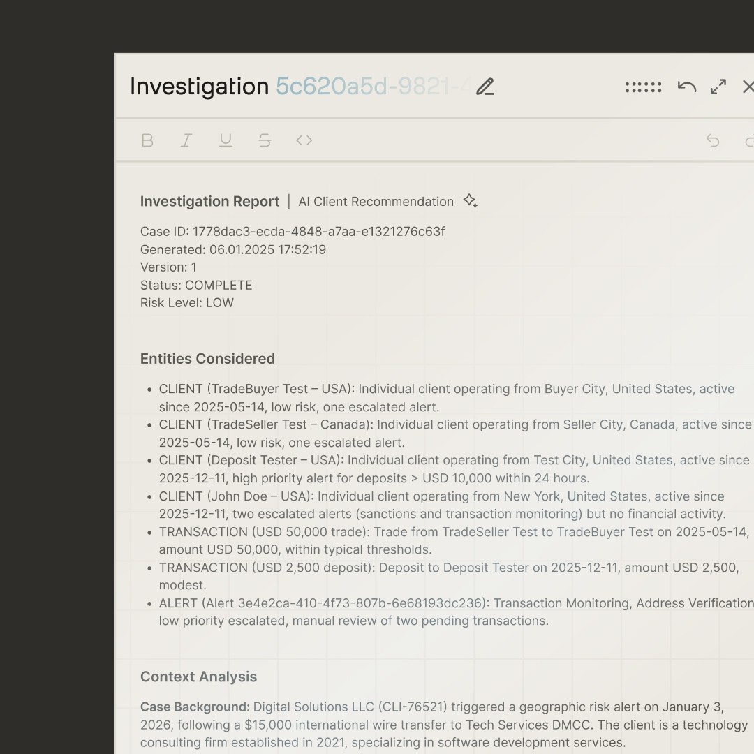 Alert agents study customer behavior, related activity, and your team’s past dispositions to suggest the right next step for every alert - accelerating triage while preserving full human control.