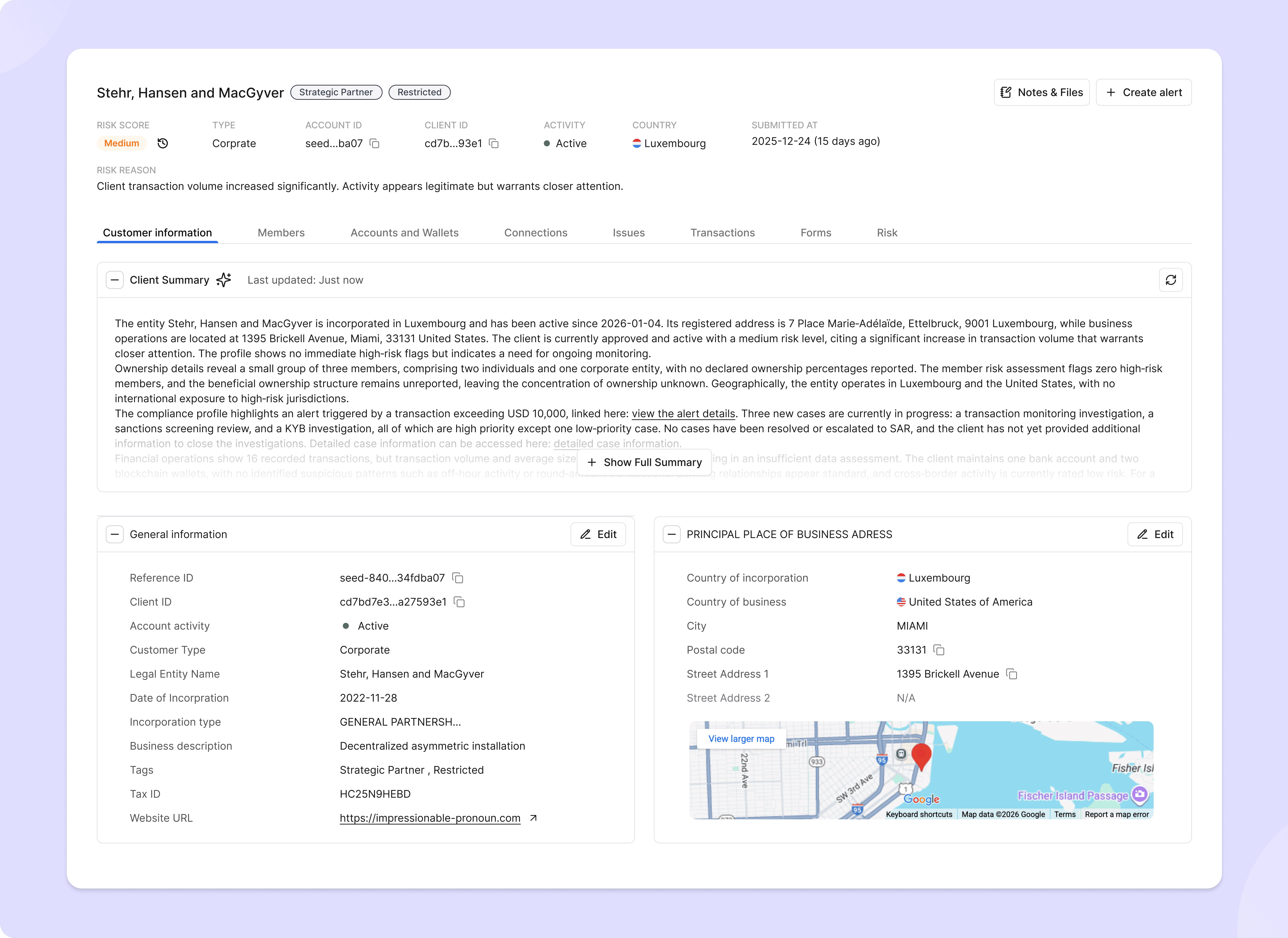 Every user, business, and counterparty represented through a single, dynamic record - enriched by data from onboarding, KYC/KYB, transaction monitoring, blockchain analytics, fraud systems, internal tools, and vendor platforms.