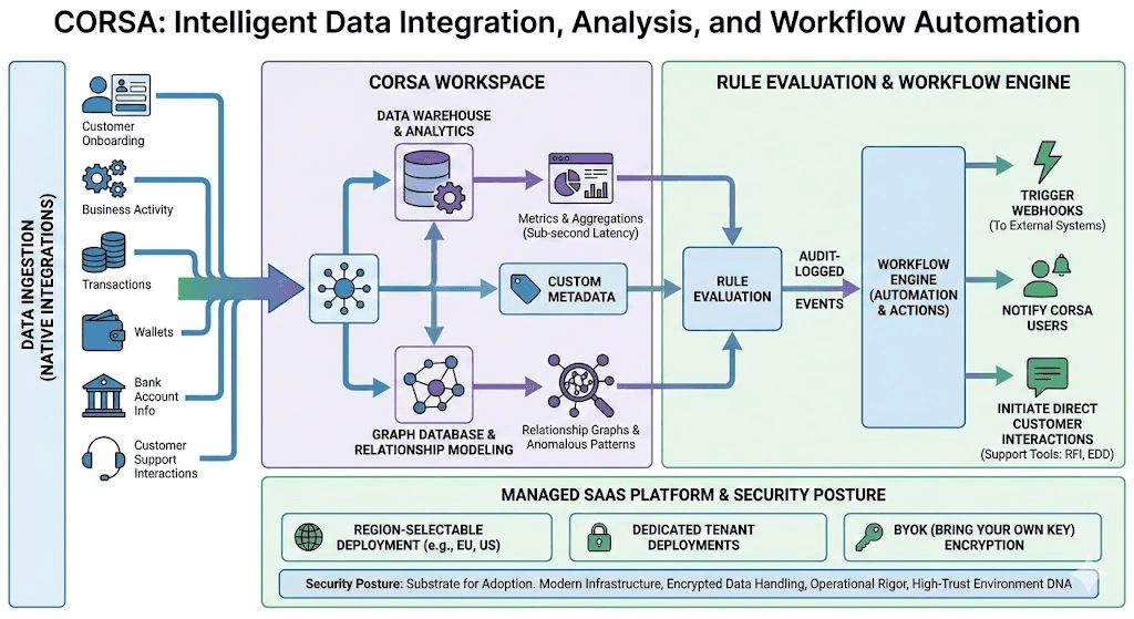 Corsa is designed to ingest and normalize inputs from every vendor participating in financial activity within an institution into a unified data layer. This includes client onboarding state (KYC/KYB attributes, documents, decisions), account and wallet topology (bank accounts, custody, crypto wallets, relationships), vendor intelligence signals (blockchain analytics, identity verification, custody and infrastructure signals), and graph/time-series representations (relationship risk propagation, rolling aggregates, velocity modeling, anomaly surfaces).