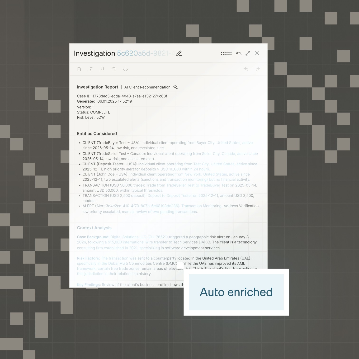 Manage RFIs from regulators and partners, and send structured RFIs to customers, directly within alerts and cases. Documents and responses automatically sync to the underlying case, preserving full context and traceability.